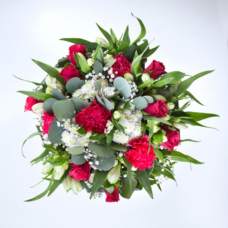 Our exceptional flower arrangement is crafted to turn everyday moments into cherished memories. This bouquet artfully blends the rich, romantic hues of red roses and carnations with the luminous appeal of mini white chrysanthemums and the whimsical charm of gypsophila. The design is further elevated by the crisp elegance of white alstroemeria and the natural touch of aspidistra leaves.
