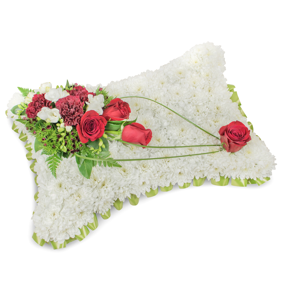 Express your deepest sympathies with our beautifully arranged bouquet featuring white chrysanthemums, red roses, and white freesias. Enhanced with dark red carnations, dianthus, and bear grass, this unique arrangement offers a heartfelt and elegant gesture.