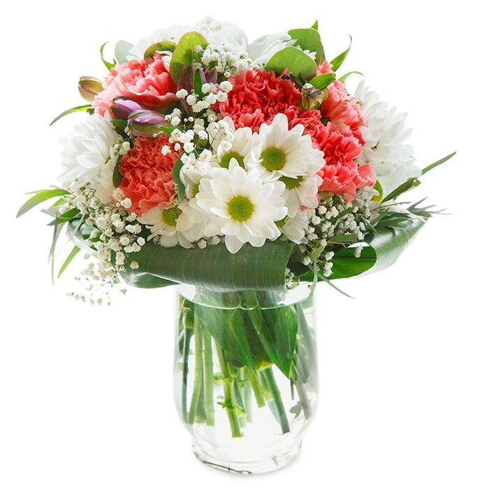 Celebrate purity and softness with our beautiful flower arrangement. This bouquet features a lovely blend of snow-white chrysanthemums, delicate gypsophila, and soft pink carnations, all thoughtfully arranged with vibrant aspidistra leaves.